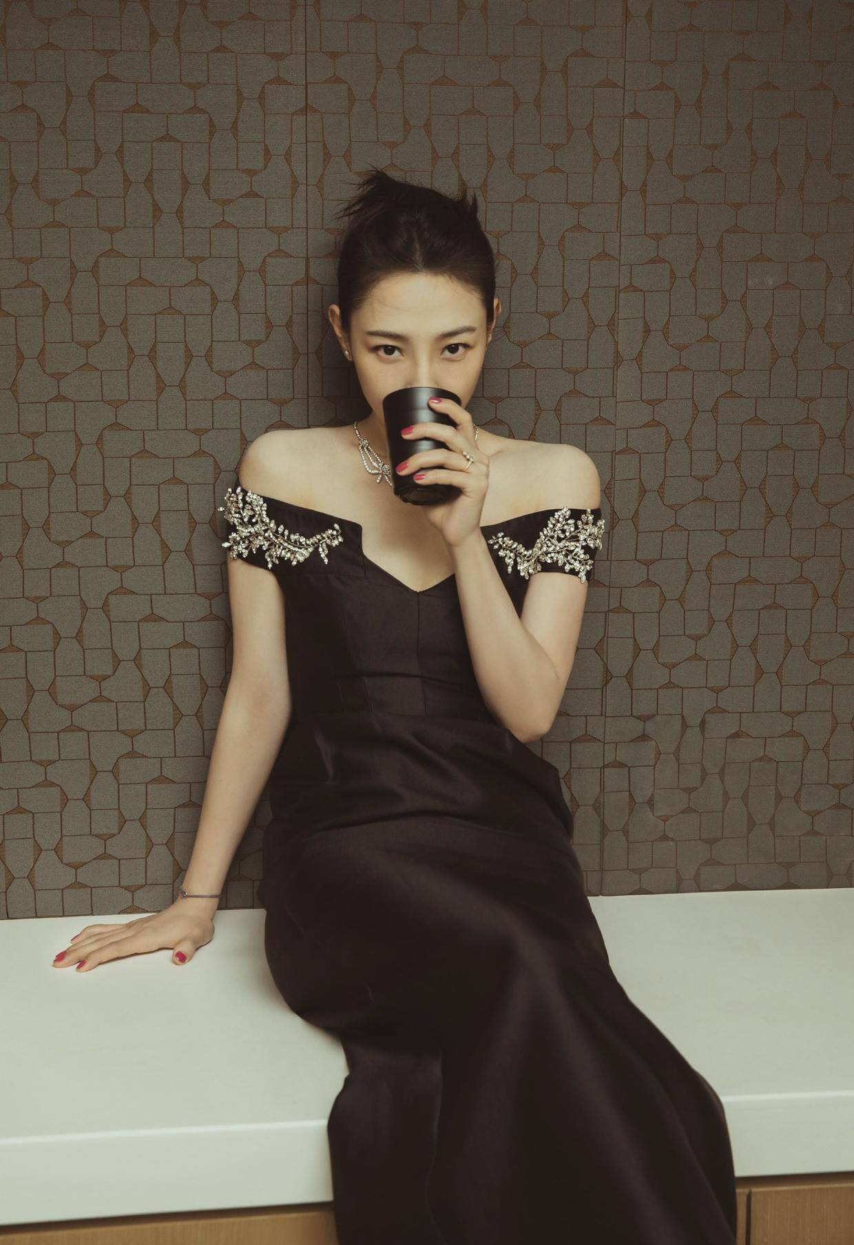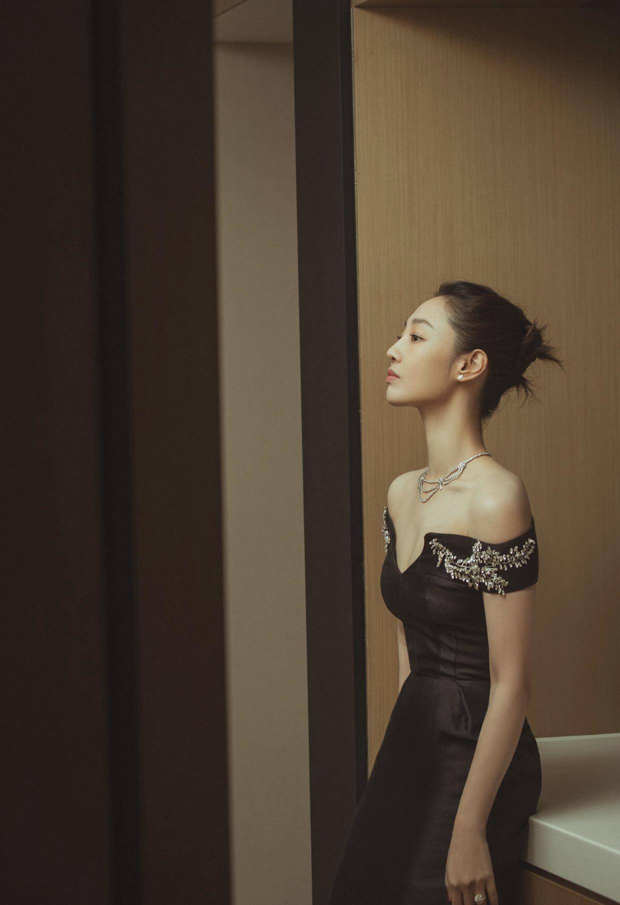 为了提升造型感、打破黑色的厚重,白百何还巧妙地利用亮钻元素来点亮暗沉,它在领口部位做了一定的装饰,还搭配了一条同样闪耀的钻石项链,这样在光线的映照下就变得更加流光四溢起来了,想不出挑都很难。